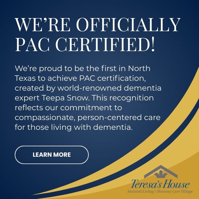 Medications are passed by State Certified Medication Aides and our staff has a level of training unmatched in the field. Every member of our team undergoes extensive PAC training (Teepa Snow’s Positive Approach to Care) in addition to Naomi Feil’s Validation Therapy.